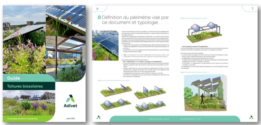 Solutions émergentes en France, les toitures biosolaires sont des toitures qui accueillent, sur la même surface, de la végétalisation et des panneaux solaires (modules photovoltaïques ou capteurs solaires thermiques), l’un au-dessus de l’autre. L’objectif de la superposition des éléments ? apporter, sur la même surface, plusieurs services écosystémiques (accueil de la flore et de la faune, production d’énergie décarbonée, gestion des eaux pluviales, développement d’îlots de fraîcheur urbains, rafraîchissement du bâtiment, etc.), afin de bénéficier de synergies positives telles que l’augmentation de la production d’énergie électrique grâce à l’évapotranspiration du complexe de végétalisation qui permet de rafraîchir les modules photovoltaïques en sous-face ou encore la diversification du couvert végétal et de la biodiversité, grâce aux zones d’ombrage induites par les panneaux solaires.