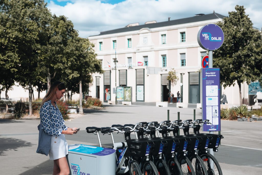 Il est fréquent, dans les villes moyennes, que les gares soient éloignées des zones d’activité et de loisirs sans que pour autant l’offre urbaine de transport ne soit suffisante pour répondre aux besoins de déplacement. Pour y remédier, le syndicat mixte régional de transports Nouvelle-Aquitaine mobilités et l’entreprise Fifteen, spécialisée dans la conception, la fabrication et le déploiement de services publics de location de vélos, ont imaginé un nouveau service de partage de vélos disponible dans les gares. « Certaines personnes préfèrent l’usage de la voiture à celui du train parce qu’une fois arrivées à la gare, elles ne savent pas comment atteindre leur destination finale. L’idée du système Vélo Modalis est de proposer une solution pour les derniers kilomètres du parcours tout en développant l’usage du train» explique Hamira Haberah, co-fondatrice de Fifteen. Depuis plus d’un an, le service de partage Vélo Modalis est installé dans neuf gares ferroviaires de la ligne TER Royan-Angoulême pour encourager la pratique du vélo sur le territoire, en intermodalité avec le TER et les cars interurbains. Pour la somme de quinze euros par mois, les abonnés du TER et des cars régionaux peuvent emprunter un vélo à la gare et l’utiliser jusqu’à douze heures par jour, avec la possibilité de réserver le vélo en station 1h30 à l’avance. Pour les visiteurs occasionnels, la location est accessible grâce au pass 24h ouvert aux locaux et aux touristes.